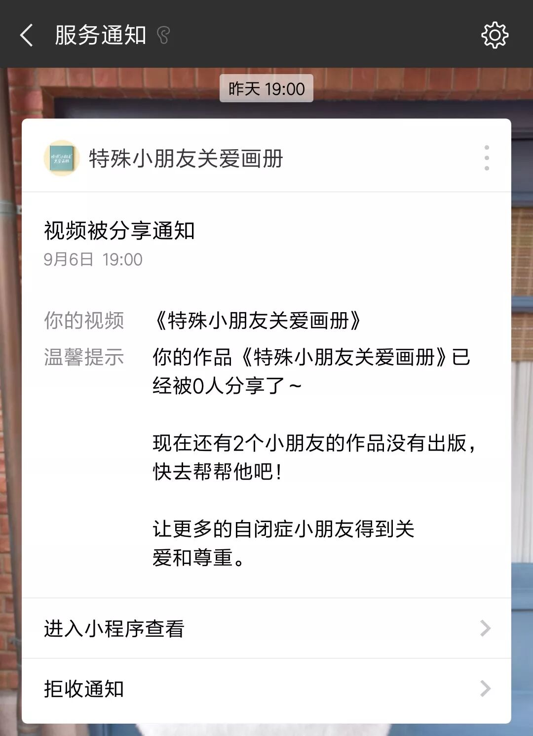 “特殊小朋友关爱画册”会利用服务通知提醒用户,作品已被多少人分享;告诉用户还有几位小朋友的作品没有出版,呼吁去帮助他们。