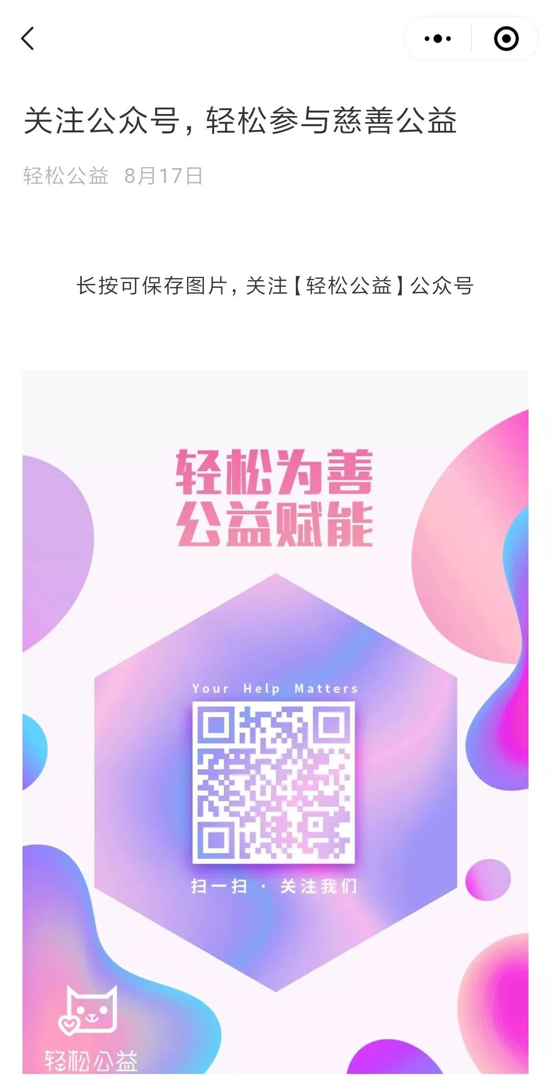 2. 在选择画作的页面,点击轻松筹的logo,将出现一篇题为《关注公众号,轻松参与慈善公益》的公众号文章,引导用户关注公众号“轻松公益”。