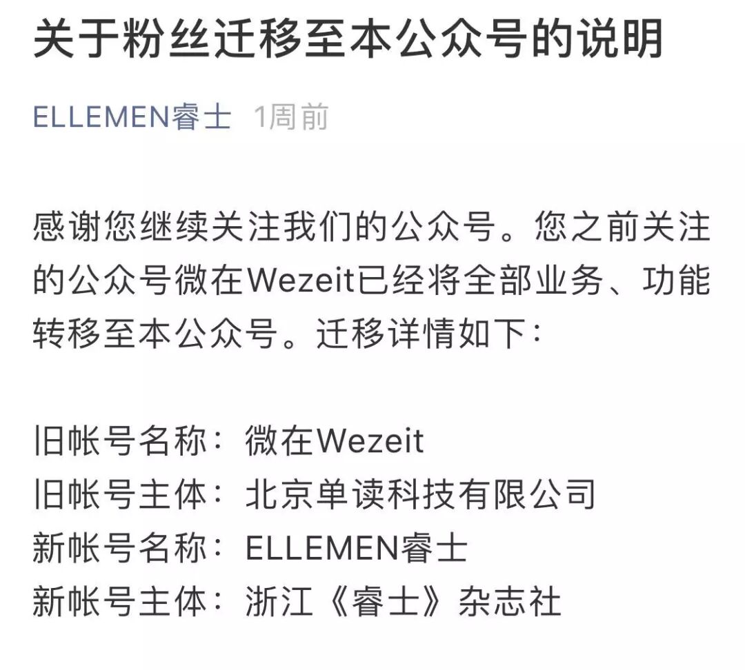 “ELLEMEN睿士”在半年内涨了50万粉,主要靠的砸广点通和收购公众号“微在Wezeit”,将30万高质量的粉丝迁移到了自己的公号里。