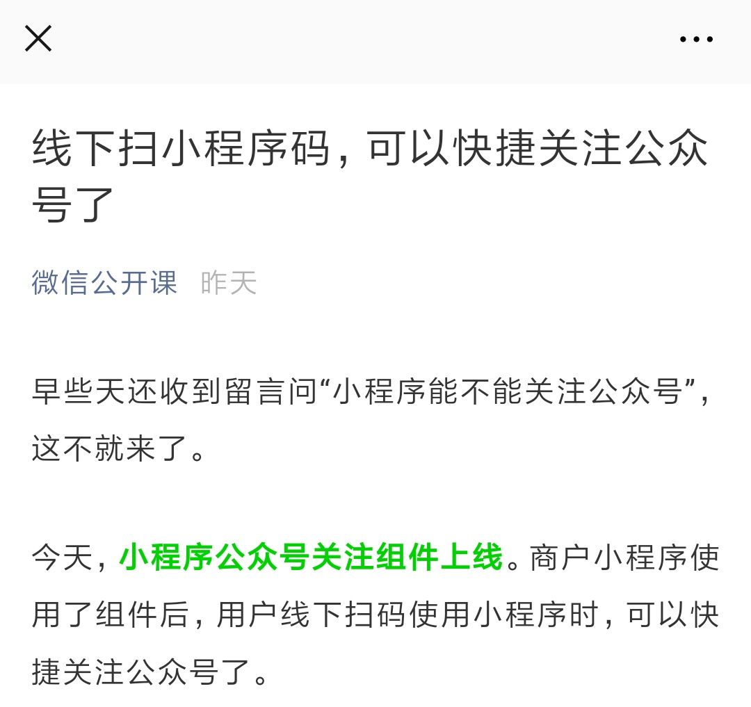 又一次,微信在深夜扔下了重磅讯息:小程序公众号关注组件上线。