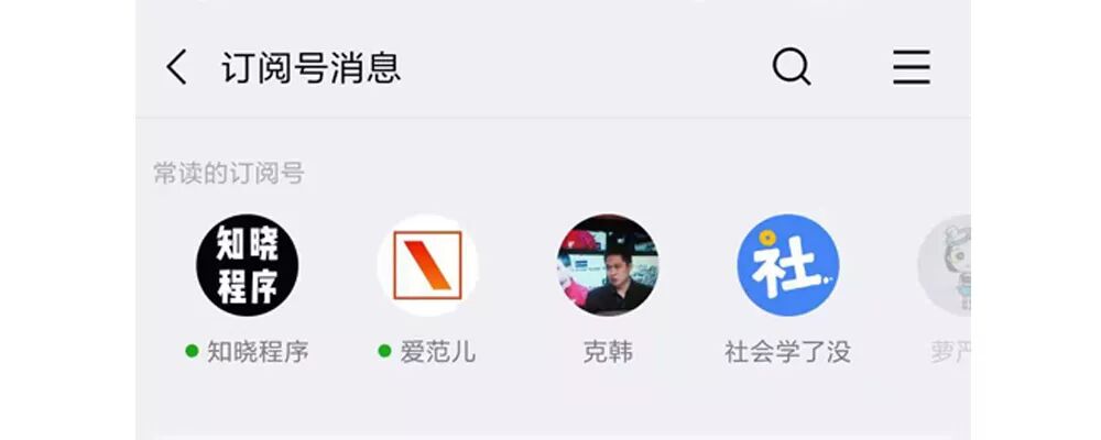 打开订阅号一栏,会发现订阅号最上方也出现了主页下拉小程序栏的页面。不同的是,订阅号下拉只有一栏常读的订阅号,并没有星标订阅号入口。