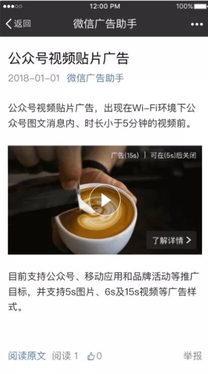 公众号视频贴片广告,出现在WiFi环境下公众号图文消息内、时长大于5分钟的视频前,可以更好地吸引用户的注意力,增加用户广告停留时长。