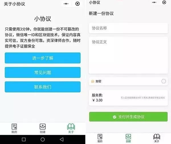第三,电子合约类。“小协议”号称是第一个区块链小程序。官方声称,用户3分钟就能创建一份不可篡改的协议。不过上线仅两天,“小协议”就遭遇下架,原因是微信不支持加密服务。这不禁让人怀疑,小程序是否真能搭载区块链技术,这种电子合约的法律效力又值几何。