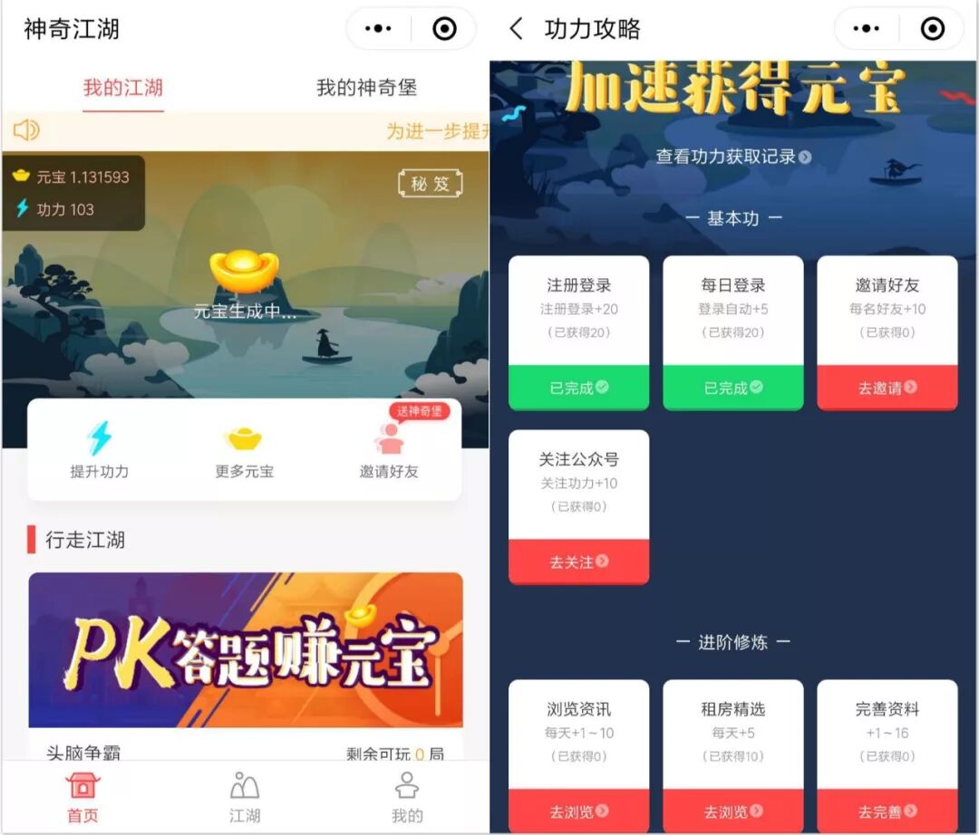 “挖矿”本身就具有游戏化属性,套上一个虚拟世界的外壳,就成了“区块链游戏”。以“神奇江湖”为例,这个小游戏会引导用户通过各种操作,提升“功力”以获取更多“元宝”,再用“元宝”竞抽“神奇堡”或实物奖励。
