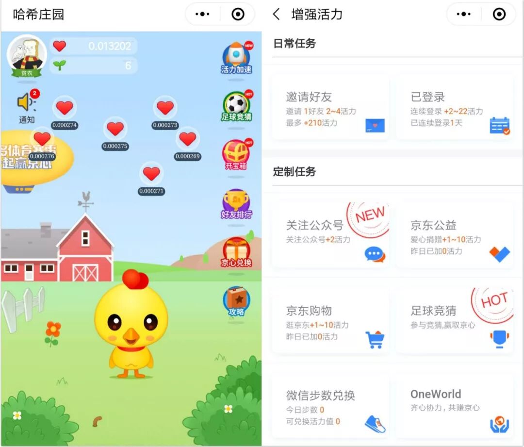 今年5月,京东发布“哈希庄园”小程序。这是一个类似“蚂蚁庄园”的小程序,用户的一系列网络活动,可以提升“活力”以获取更多“京心”,再用“京心”竞拍实物奖励。