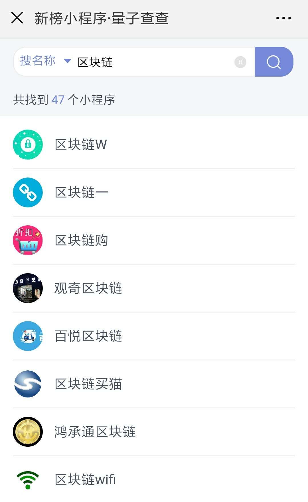 新榜的“小程序查查”工具中,可以检索到“区块链”等关键词。不过因为微信搜索关闭,并不能一一点击试用。我只能凭借过往经验和报道略作盘点: