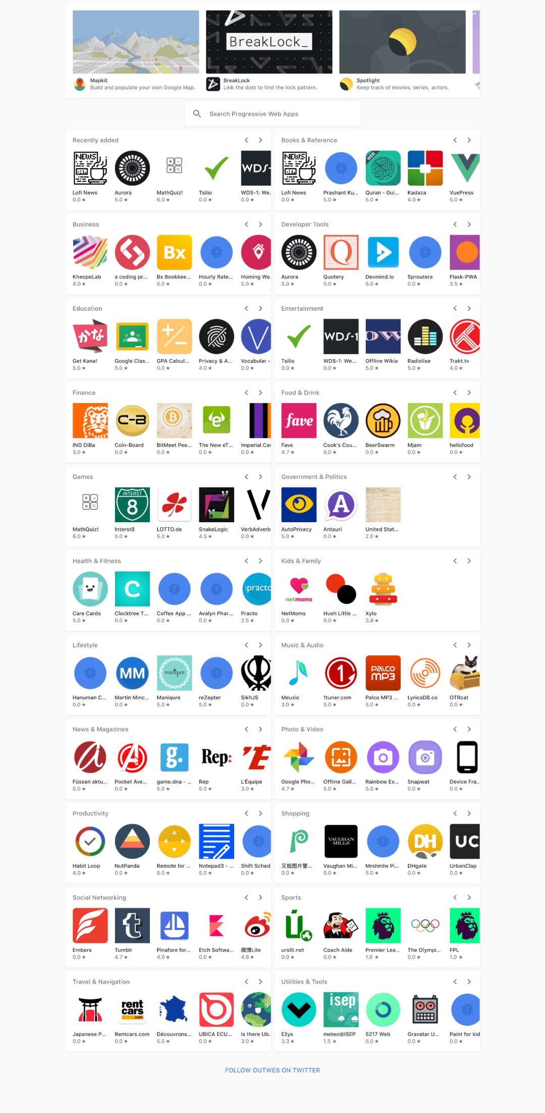 PWA在国外算是百花齐放,比如推特,Instagram,Flipboard,Telegram,Offline Wikipedia,Spotlight都提供了PWA版本,并且用户体验与原生App相差不大。[3]