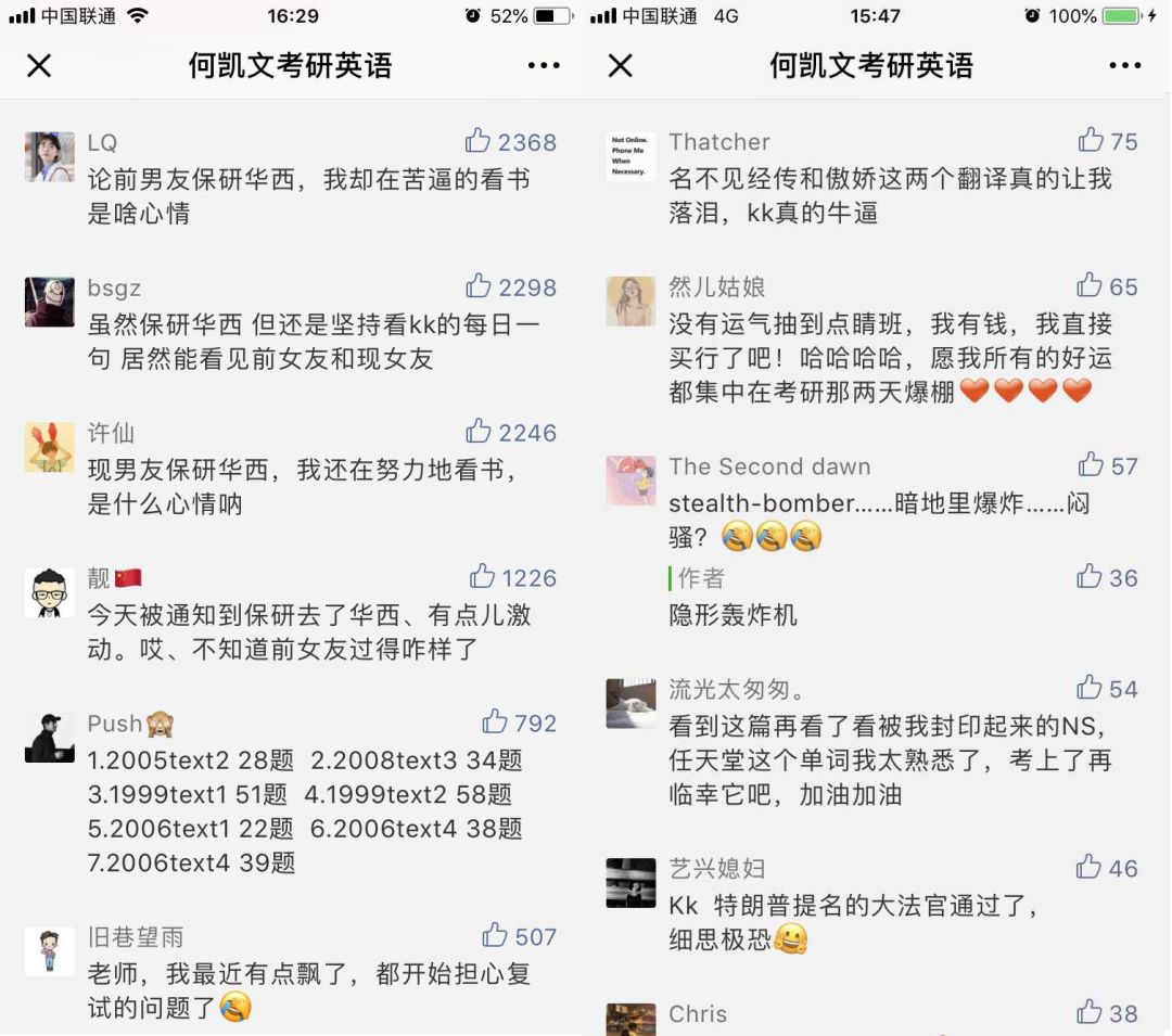何凯文:对,我记得有一个人,每天都在我的公众号里留言骂我,后来他突然在微博上给我发录取通知书,说自己考上了,很感谢我。我把他的留言和次数截图给他,我说谢谢你,你看你这么执着。他很尴尬,但其实很有意思。