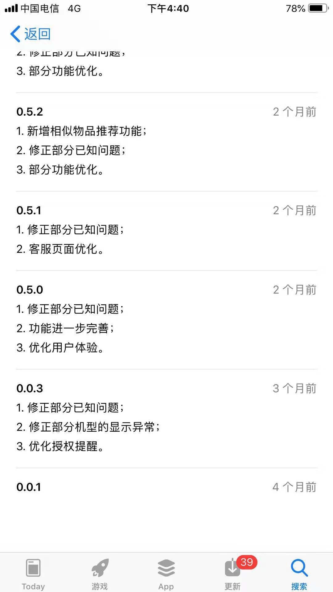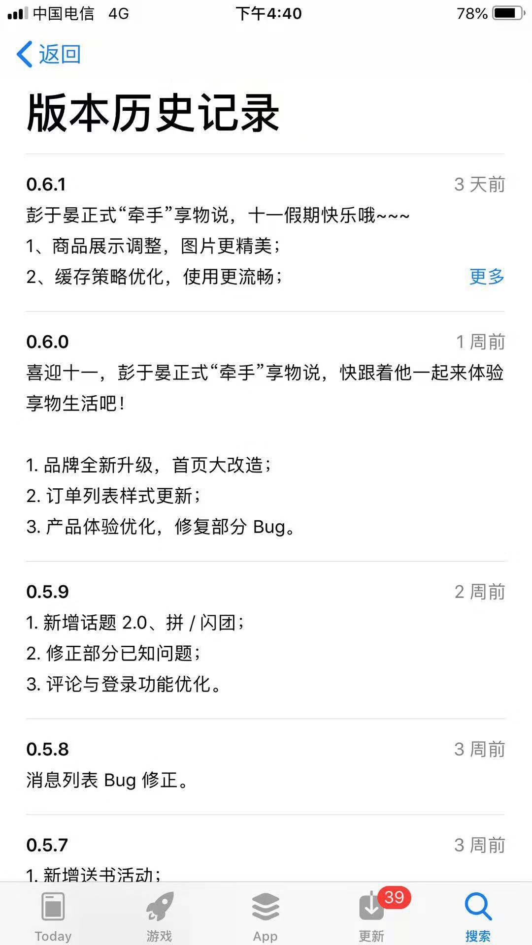 根据App Store中的历史版本记录,早在四个月前,享物说App 0.0.1版本就已经上线。最近两个月,基本保持每周一次的版本更新节奏,但到目前,最新版本仍然是0.6.1,连1.0都不算,这也意味着,在享物说团队眼里,目前的App还处于早期测试阶段。