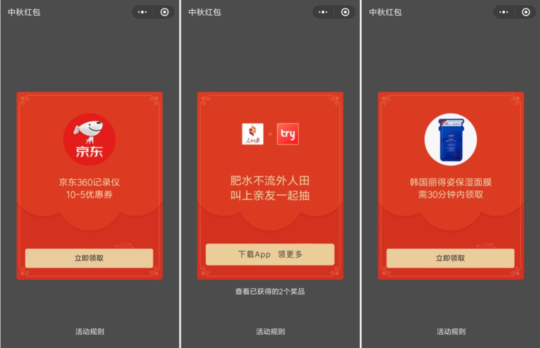 中秋节当天,trytry还和人民日报合作了中秋送福利的活动。在人民日报客户端、公众号推文,点开“中秋红包”,用户会进入trytry小程序,可抽到现金红包、品牌小样体验权和合作伙伴的优惠券等。