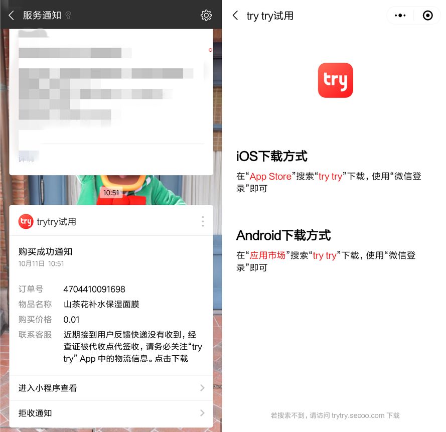 为了引导用户下载trytry App,trytry小程序做了很多引导。比如,在“trytry试用”下单后引导用户在App查看物流信息。