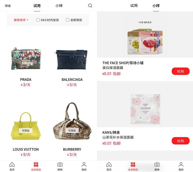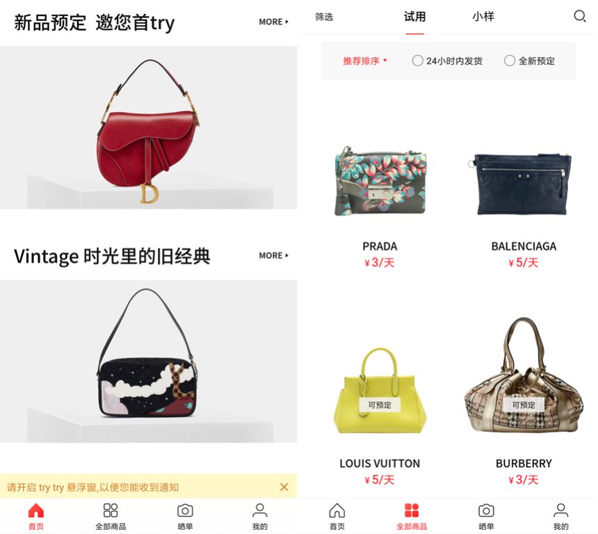 用户在购买美妆产品、包袋前,都会想试用商品,了解其是否真的适合自己。因为万一买回来、用了之后才发现不适合,无论是挂在二手平台上出售,还是闲置,都会造成一定损失,坠入沉没成本的陷阱。