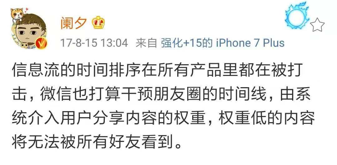反过来,如果微信更重视内容消费,和微博一样在朋友圈搞起了算法,想必又要引起大规模不满——事实上,算法早已介入朋友圈,同一条朋友圈有人看得见有人看不见,只是很多人并未察觉罢了。