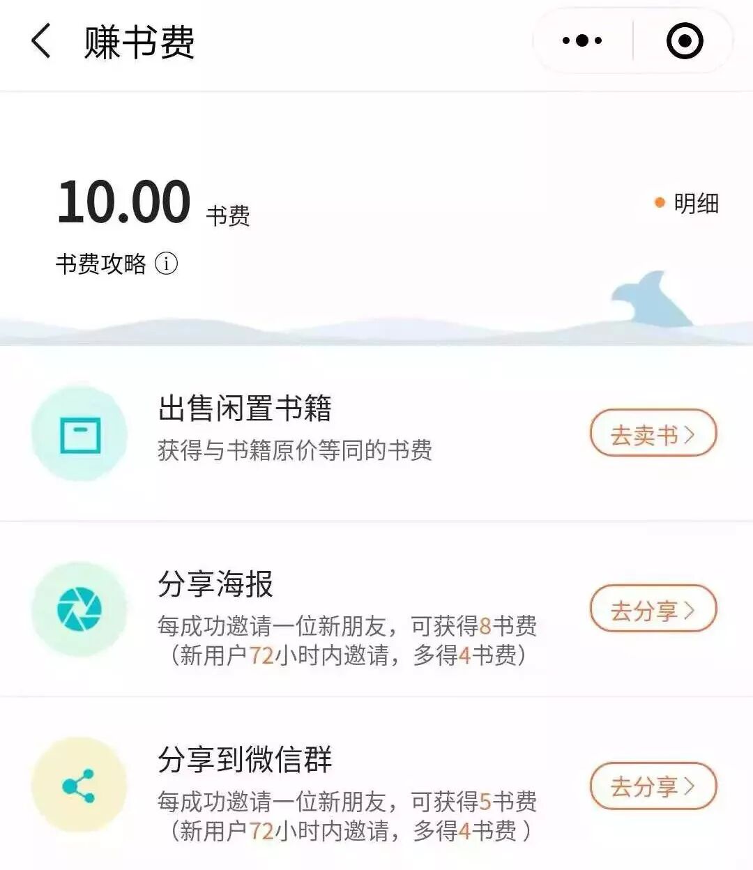 在如今的「漫游鲸」小程序主页醒目位置,有“限量书费红包,免费领取”十个字,点进去会看到一点稀松平常的分享裂变套路:“分享海报成功邀请一位朋友,双方可各获8书费;分享到微信群每成功邀请一位新朋友,双方可各获5书费;新用户在72小时邀请可多得4书费。”