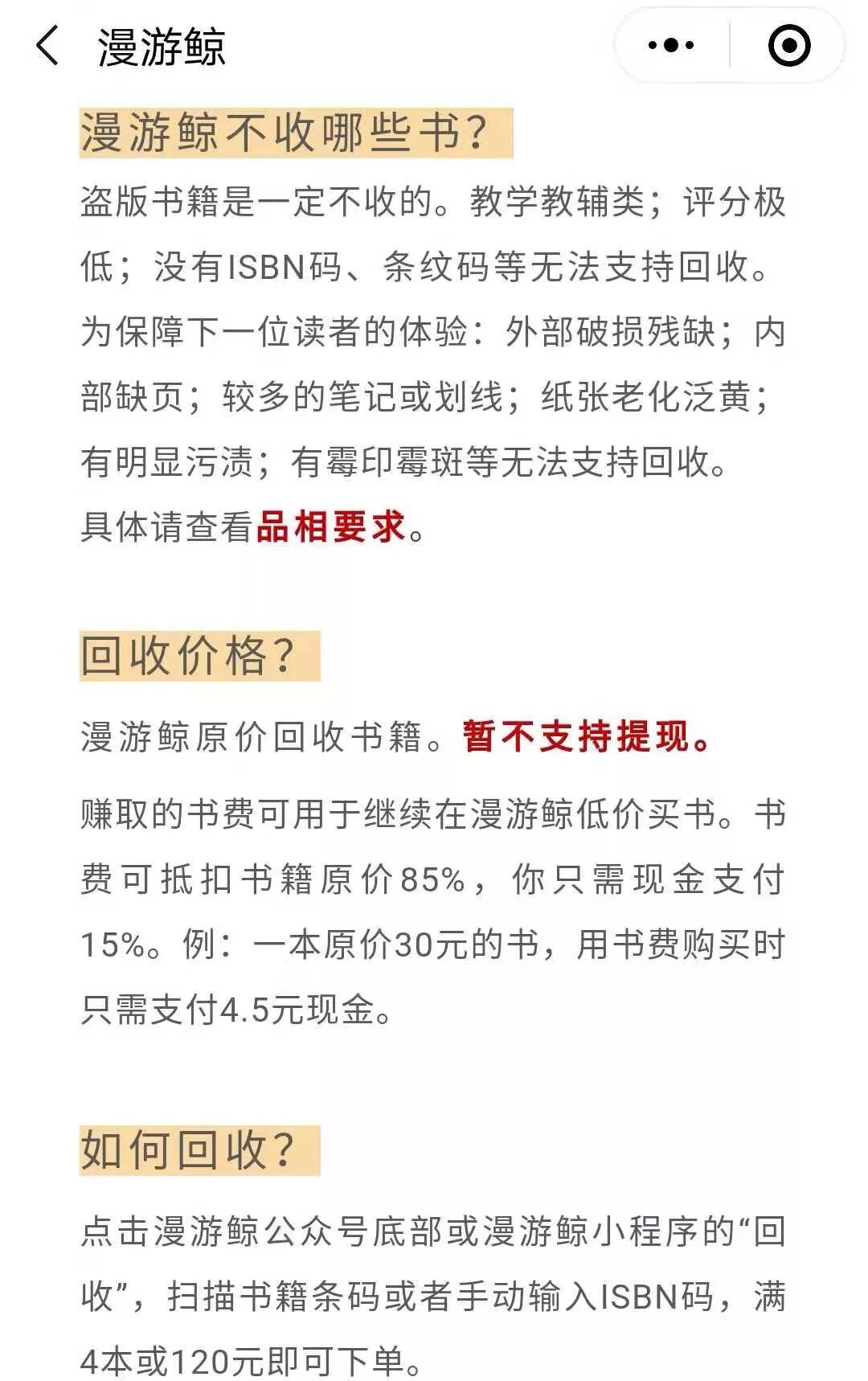 通过扫描书籍背后的条形码,「漫游鲸」平台按“原价“回收用户手中的旧书,同时返以等额的平台积分(买书时可用来抵扣书价)。用户回过头来再买书时,只需支付书价的15%现金,存在账户的积分则可抵扣剩下的85%。