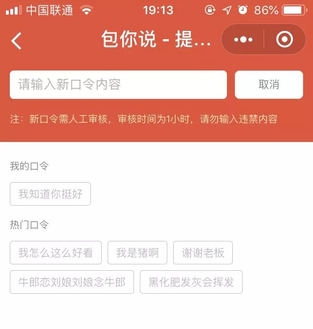 比如以前用户可以在「包你说」中自定义语音口令内容,这样趣味性和自由度会更高。但最近随着平台规则的整改,用户在发口令内容时,需要等待1个小时的审核时间。