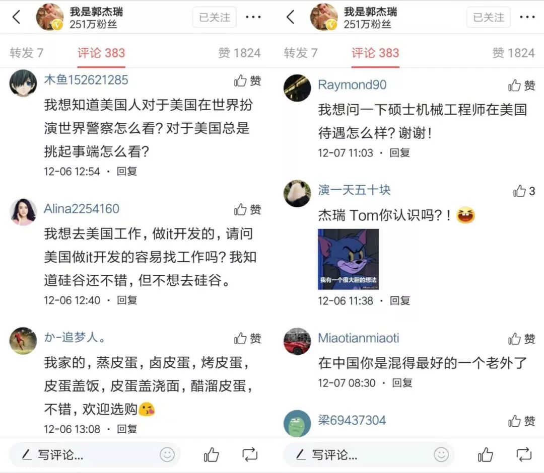 郭杰瑞:有人问我“Jerry,Tom你认识吗”,其实是《猫和老鼠》里面的梗;我和华农兄弟互动,有人评论“这个美国人好漂亮哦,不如我们……”;前几天我测评最解腻的饮料,去超市拍货架被赶出来,有人评论“超市怕打假的来了”。