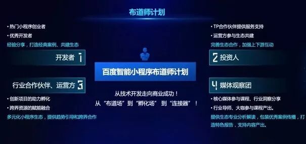课上,百度App业务部总经理、智能小程序业务负责人平晓黎宣布正式启动“小程序步道师计划”。该计划意在聚集行业内优秀的开发者、运营方、投资人、TP 伙伴、媒体观察者们,通过线上、线下渠道分享导师们的实操经验、前瞻研究、深度思考,帮助开发者更好地了解智能小程序生态、参与生态发展与建设。