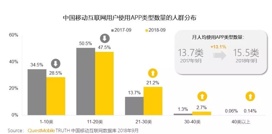 从QuestMobile统计的的中国移动互联网用户使用App类型数量的人群分布看,截止2018年9月,用户忠诚度进一步降低,用户注意力向更多细分App类型分散,倾向尝试使用更多场景化的App类型。