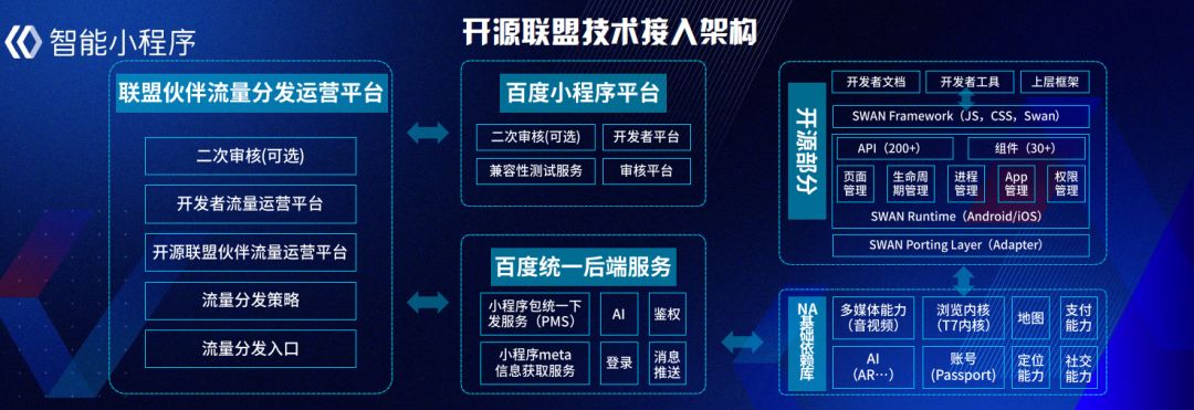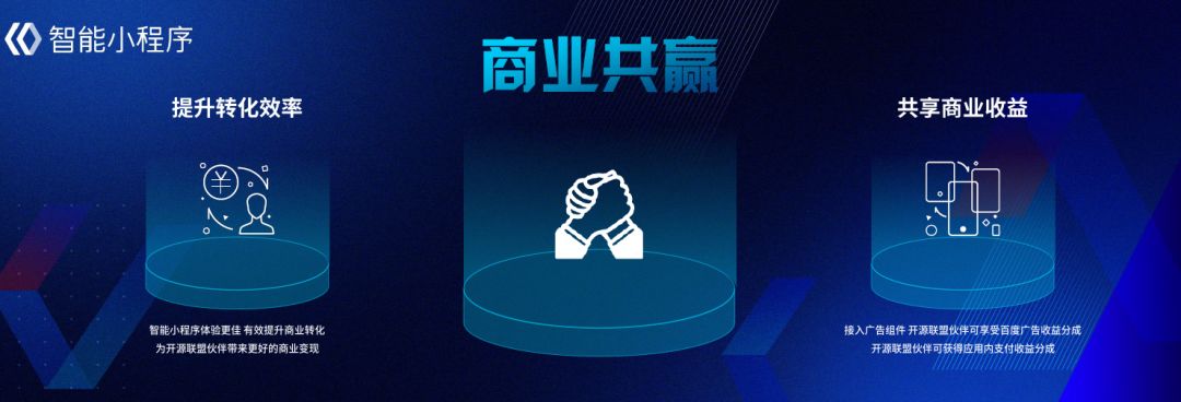 从诞生之日起,除名称上多出的“智能”二字,百度小程序主打“开源”,作为与微信、支付宝等其他小程序平台最鲜明的区隔化元素。