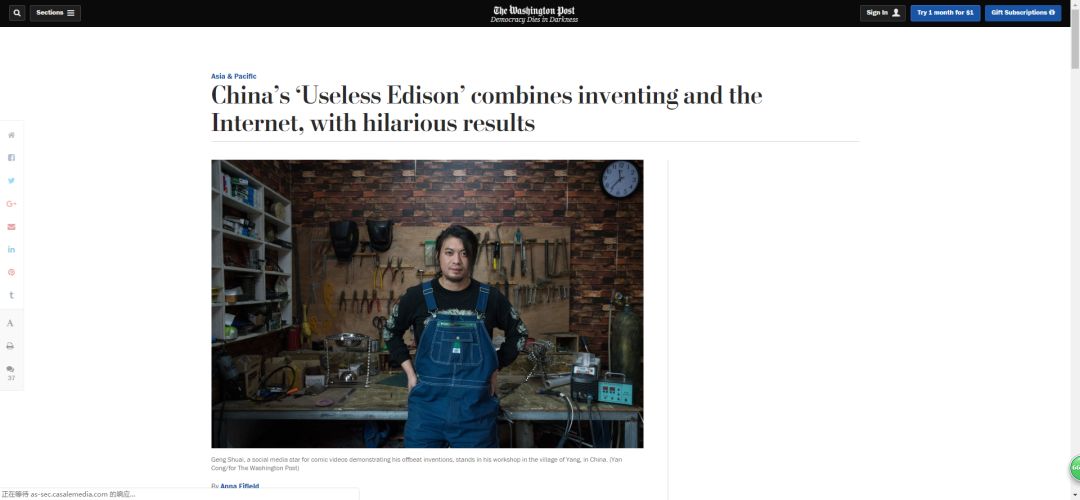 《华盛顿邮报》刊载了一篇耿哥专访,引用了他的金句“以前很多人笑话我做的东西没用,现在有100万人笑话我了”。