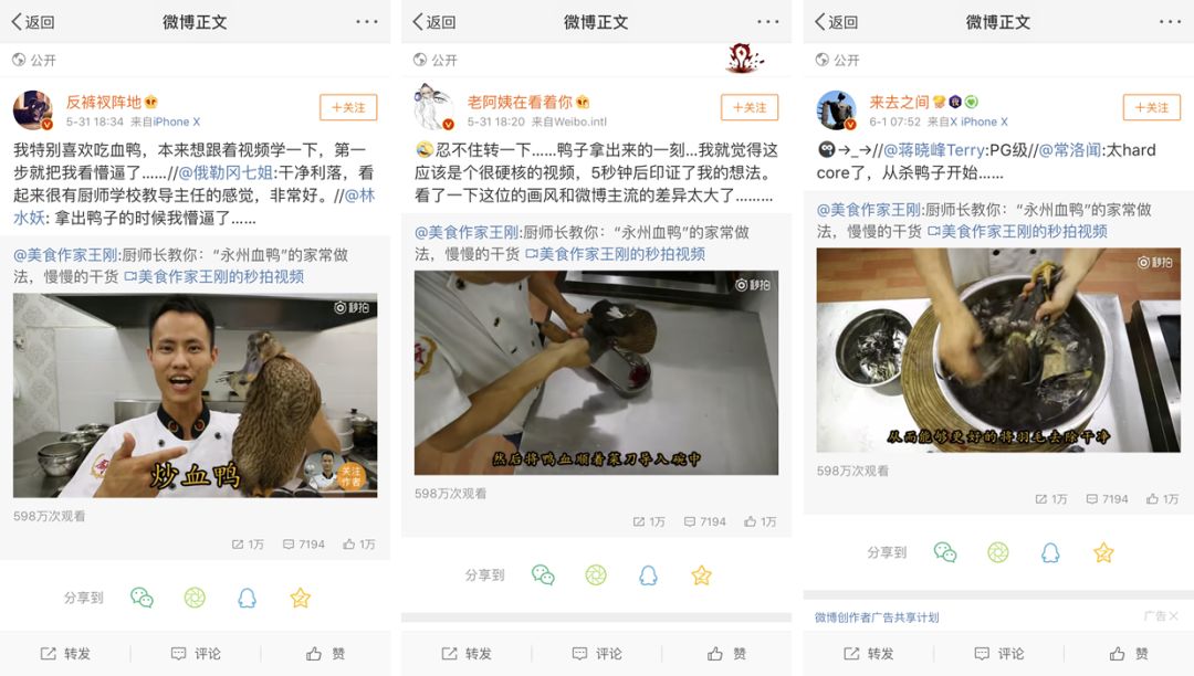 同样不走小清新路线的,还有被冠以“硬核博主”之称的「美食作家王刚」。6月之前,王刚还是头条和B站的小众博主,直到他拎着一只活鸭子出现在镜头前,“今天,我教大家做永州血鸭”。@老阿姨在看着你 觉得,“这位的画风和微博主流的差异太大了。”