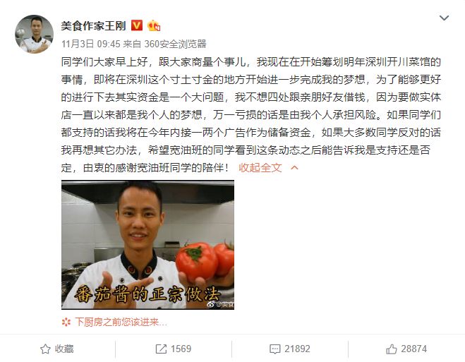 而曾经的大厨王刚,在网上发布一年短视频之后,宣布要在寸土寸金的深圳开一家自己的川菜馆,这是一个还没做完的梦,原本计划3年后实现,但互联网缩短了这条梦想之路的距离。他曾经向新榜透露:“如果有更大的后厨,我可以拍出更好的做菜视频。”