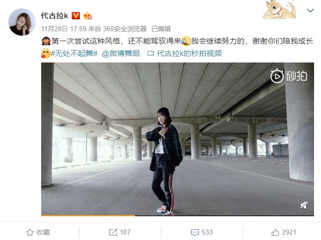 「代古拉K」最近去了街舞博主「Jin小菌」的Vlog客串,说她再也不想跳那支成名的舞蹈了,“因为这根本不叫跳舞啊”。以前看自己的视频,100遍都看不够,但现在的情况反了,或许跳100遍都不满意。
