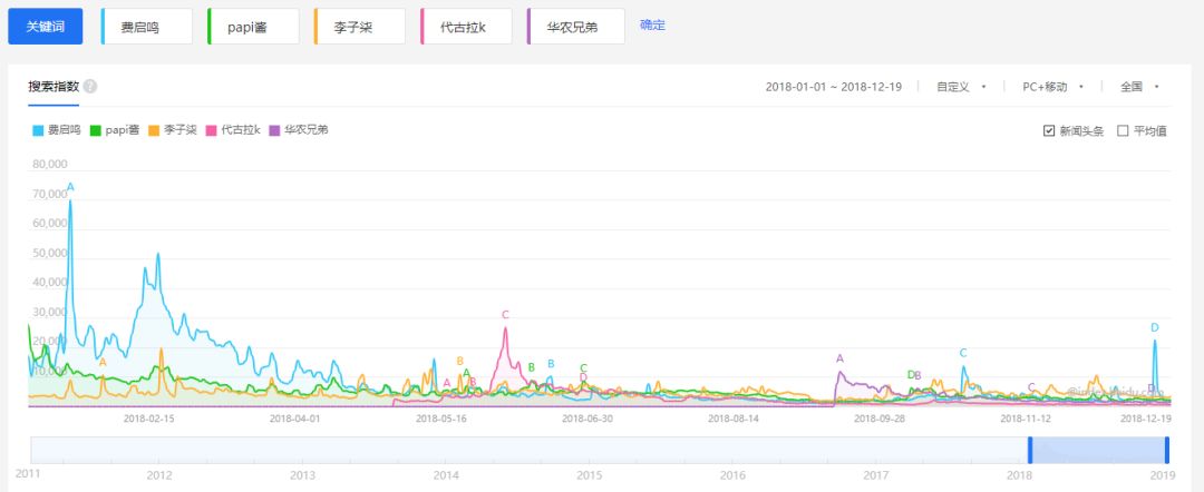 费启鸣、papi酱、李子柒、代古拉K、华农兄弟今年的百度搜索指数