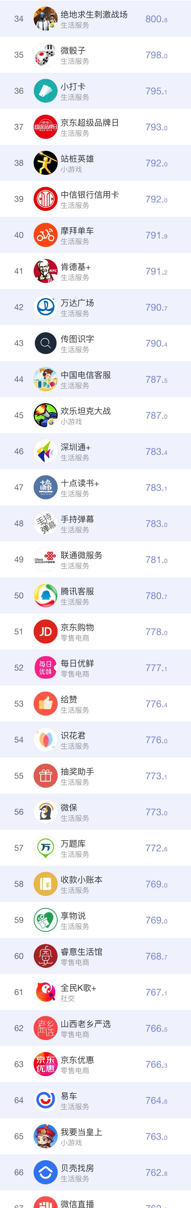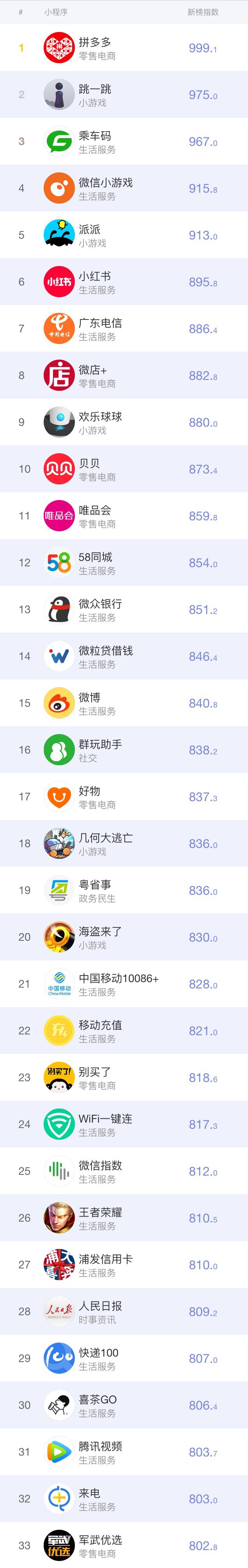 「拼多多」挤下蝉联榜首两周的「乘车码」,再度夺冠,可见社交电商的魅力有多大。同为电商的「小红书」从上周的13位上升至本周第六。小程序「小红书」和App功能相似,把笔记或商品从App分享到微信里,链接内容将用小程序呈现。