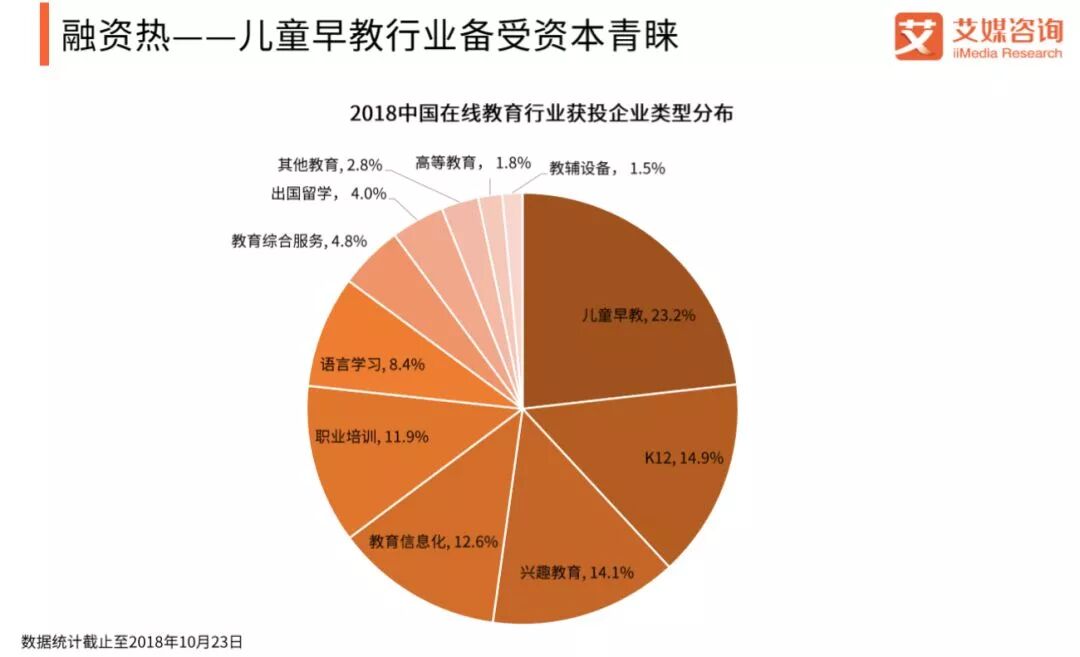 这个行业看似横跨多个领域,实际核心还是「儿童早教」。艾媒咨询数据显示,截至今年10月,在线教育领域中,儿童早教企业获投数量最高,占比23.3%。
