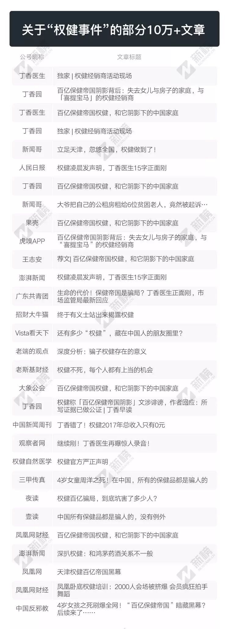 根据新榜日常连续监测的70万微信公众号,以“权健”为关键词,这两天有近2000篇文章关注“权健事件”,其中有295篇原创,诞生32篇10万+,形成一场声势浩大的声援。