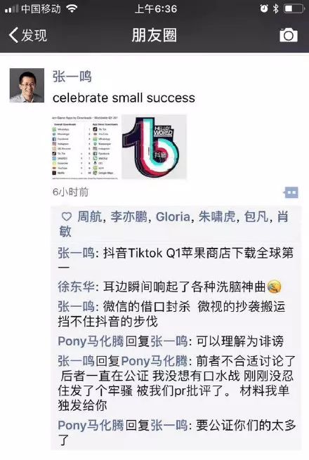 抖音的势头从春节开始一路猛涨,今日头条CEO张一鸣发了一条朋友圈,庆祝抖音Tiktok Q1苹果商店下载全球第一,评论里把矛头直指腾讯,此前暗地里进行的头腾大战被搬上了台面。