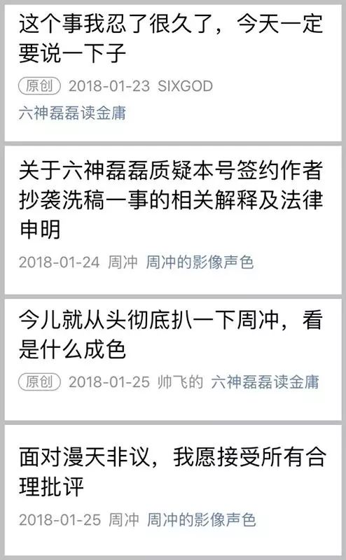 1月底,「六神磊磊读金庸」撕「周冲的影响声色」洗稿。以前关于“洗稿”的讨论很难出圈,但这次两个大号来回撕了两个回合,六神直接诉诸法律,圈内开始重新讨论洗稿的标准和解决办法。