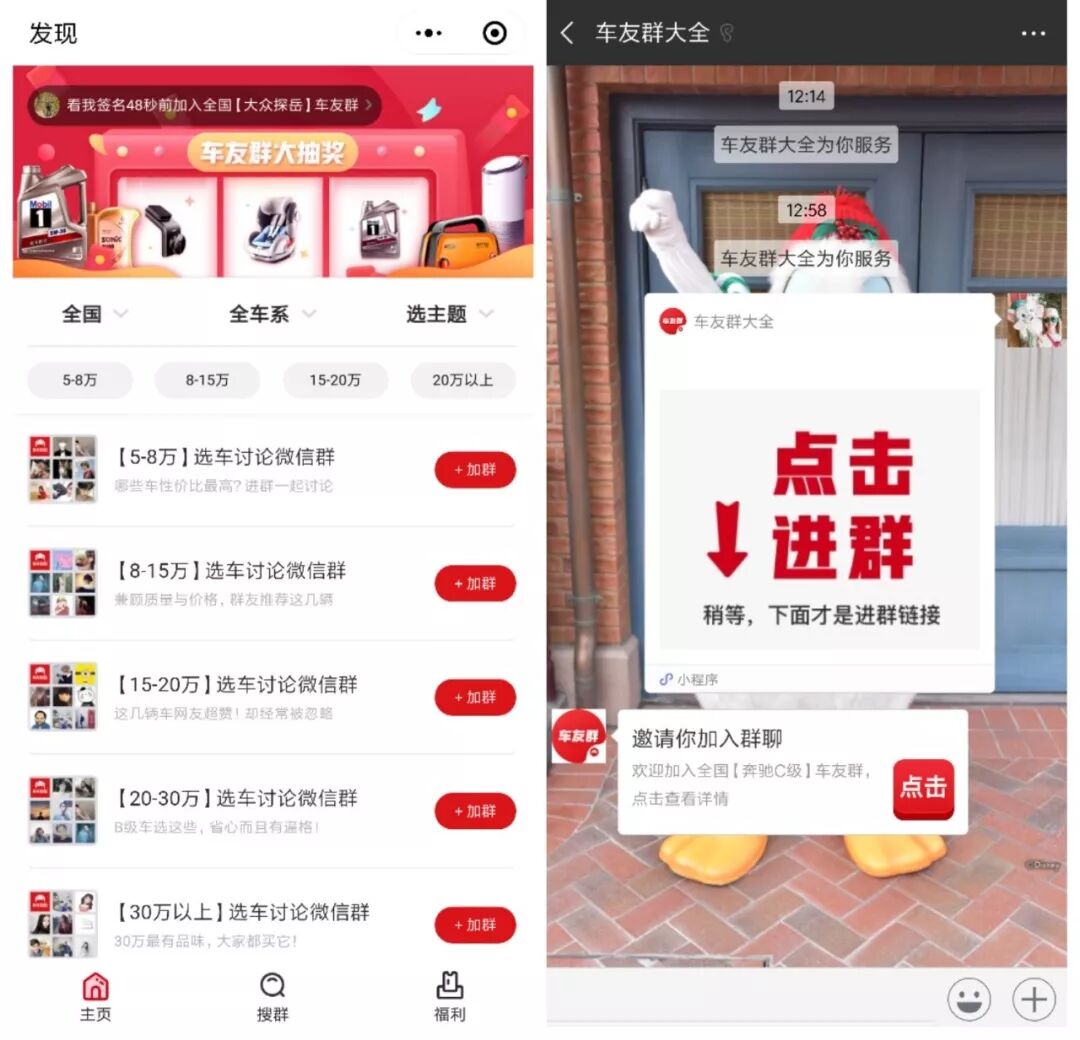 第二是在微信群里和车友讨论交流。目前,有车以后有5000多个微信车友群,超过100万汽车用户。在小程序“车友群大全”,用户可以通过筛选地区、车型、主题,找到最适合自己需求的群。通过客服消息的自动回复,获取微信群二维码。据透露,微信群都由机器人管理。