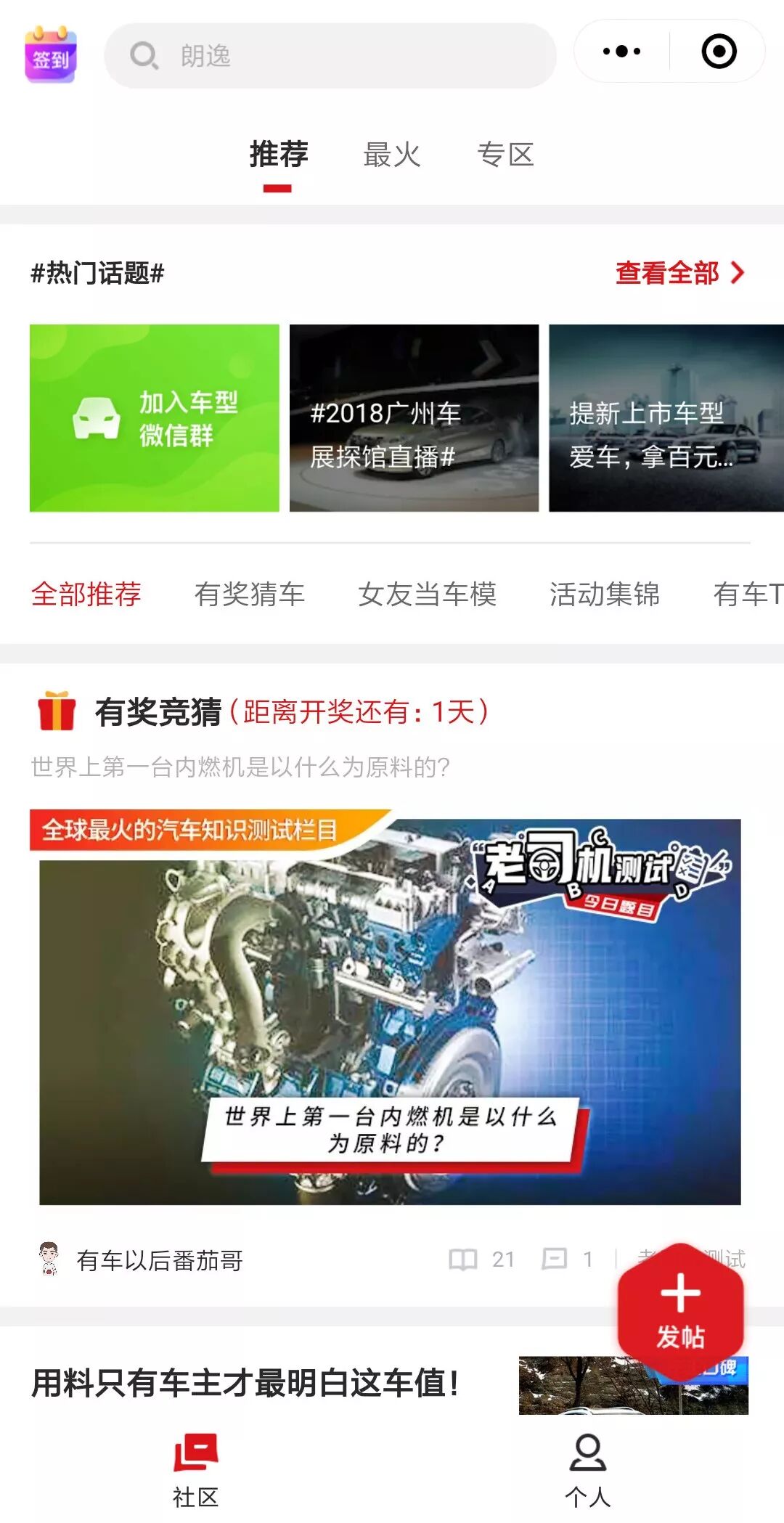 有车以后的社区分为两种载体。第一是在小程序和App端的全国最大的移动汽车社区。在小程序“车友论坛”里,用户可以发帖分享和汽车相关的内容,包括自己真实的汽车生活和经历、车展探馆直播、汽车问诊、二手车咨询等。