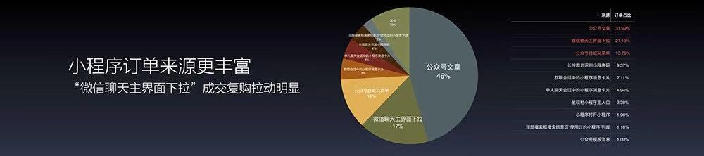 公众号文章、公众号菜单的引流占比已经从未开通小程序时的80%降低到50%左右,更多新入口出现。“微信聊天界面下拉”回流明显,占整体订单来源的18.13%。