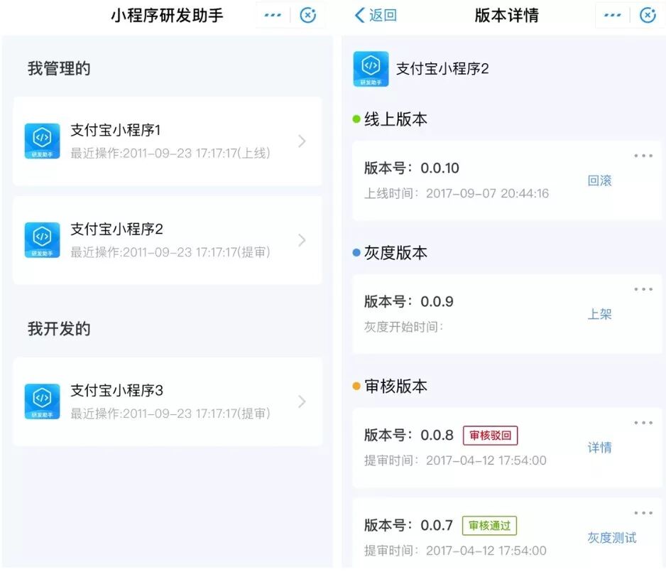 新榜讯 新版支付宝小程序研发助手正式全量上线,可以帮助开发者实现移动化管理小程序发布流程,解决之前需要频繁登录pc端进行版本操作和因为审核延时导致的开发者在通过审核后由于身边没有pc不能第一时间上线等问题。 开发者只需在IDE中上传代码,被引导至研发助手,即可进行后续操作,无需再登录开放平台进行操作。目前小程序研发助手支持以下发布流程操作:版本查看、提审、查看驳回原因、灰度测试、上架、回滚&下架、删除。 更多资讯,敬请关注公众号“量子程序”(ID:vhd999) 2018融资 招聘集锦 美宜佳 包你说 漫游鲸 加推 报告查一查 小灯塔 快递100 知识圈 小影 面相研究院 群勾搭 中华田园犬 有车以后