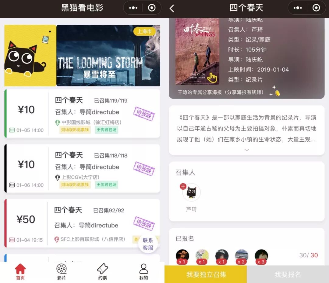 初看「黑猫看电影」,它更像是一款针对小众电影的电影拼团平台,不同的是,观影一般由有影响力的KOL发起,召集到目标人数的60%之后,平台即可安排影院排片。