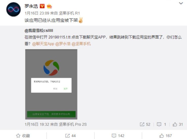 新榜讯 1月15日晚间,社交App聊天宝发布,有用户16日于应用宝下载聊天宝时发现页面跳转至应用宝下载界面,锤子科技创始人罗永浩通过微博回应称,“该应用已经从应用宝被下架。”