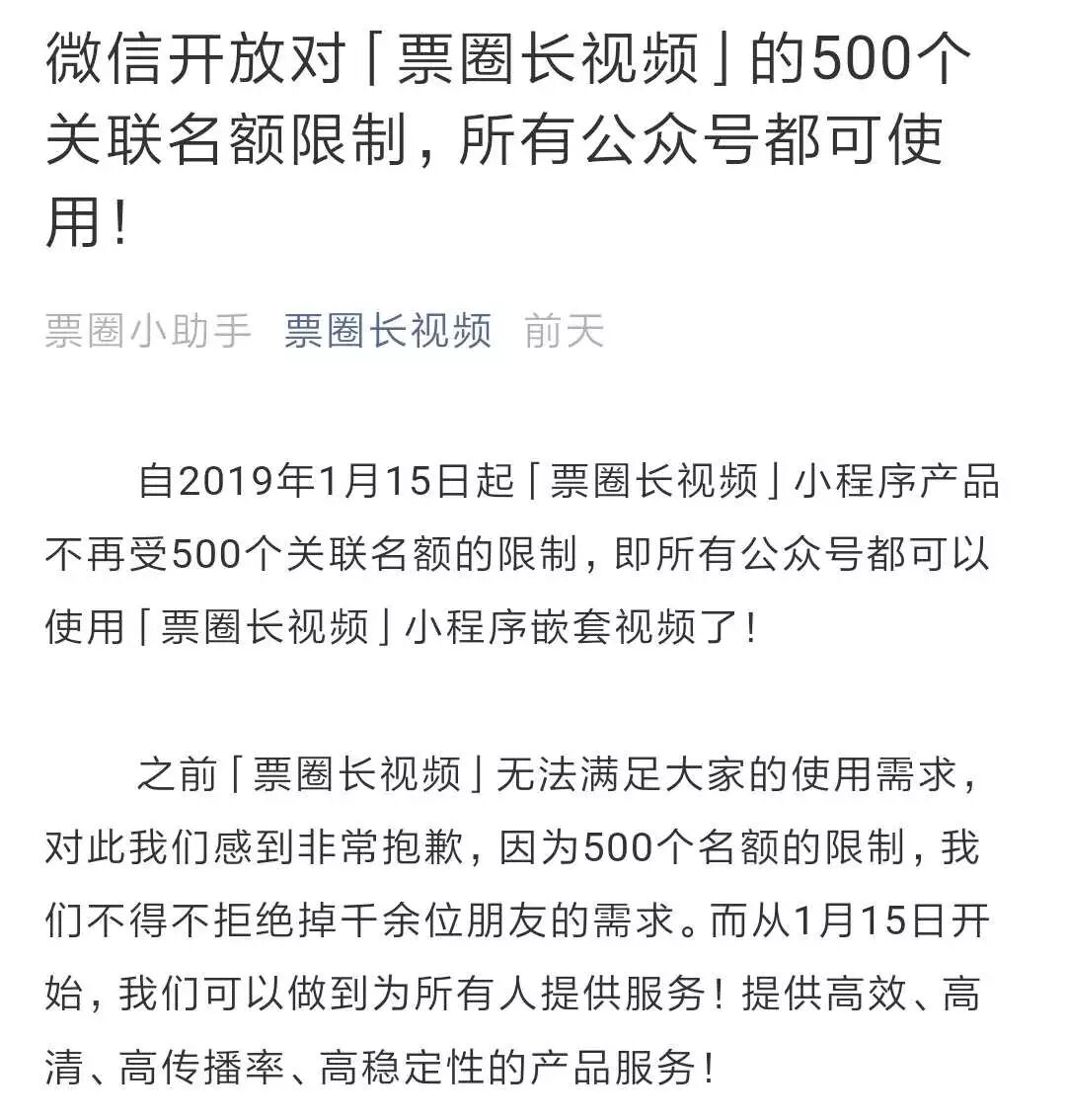 “因为500个名额限制,我们不得不拒掉千余位朋友的需求”,“票圈长视频”公众号就此发文称:“所有公众号都可以使用「票圈长视频」小程序嵌套视频了。”