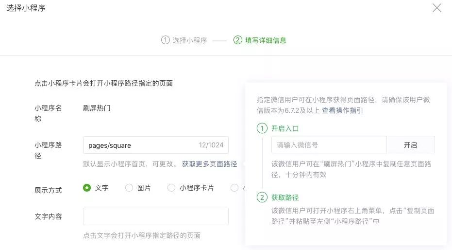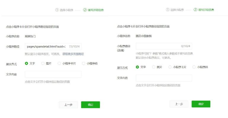 第五步:将复制的链接粘贴到“小程序路径”中,选择“展示方式”并填写“文字内容”(即小程序标题),链接小游戏页面时则无需填写小程序路径。