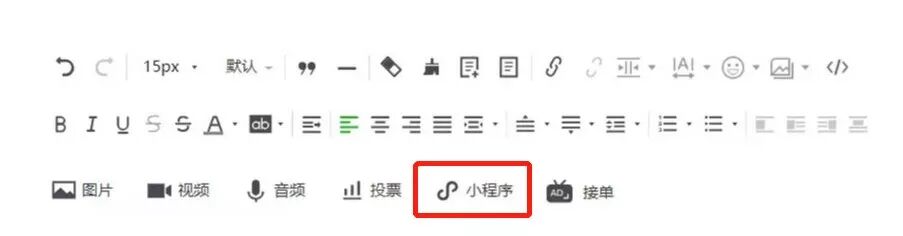 第一步:在微信公众号后台的编辑器中点击“小程序”。