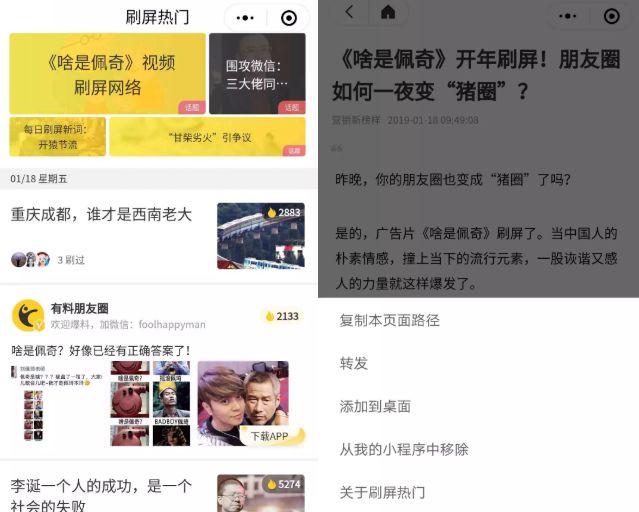 我们以在公众号中添加一个名叫「刷屏热门」的小程序为例——