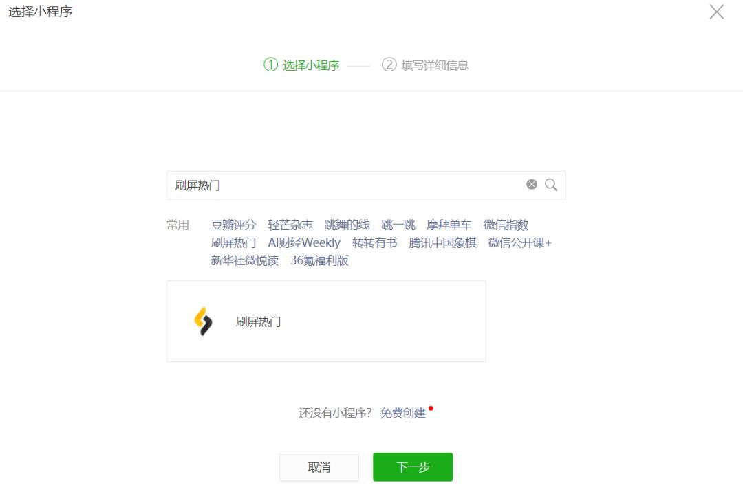 第二步:搜索找到「刷屏热门」小程序点击下一步(必须准确输入全称,还不支持模糊搜索)。
