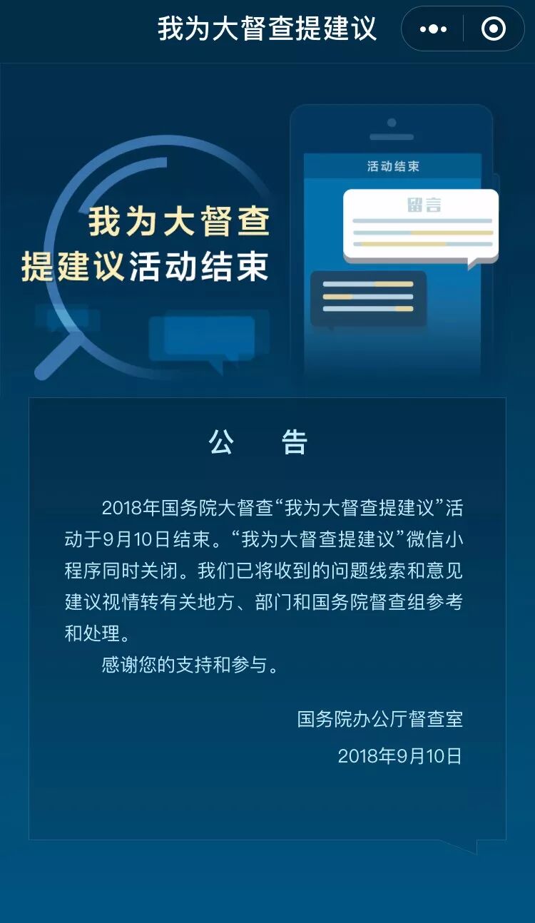 2018年7月,国务院办公厅开展“我为大督查提建议”活动,面向社会公开征集政策措施不落实、政府管理服务不到位、有关部门和单位不作为慢作为乱作为等问题线索以及相关意见建议。群众可通过「我为大督查提建议」小程序留言提建议。