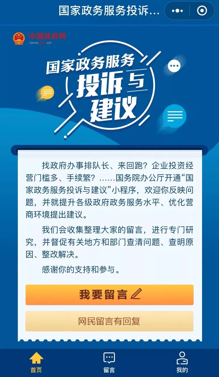 2018年9月,国务院办公厅开通「国家政务服务投诉与建议」小程序,接收社会各界对政务服务的问题线索和意见建议。