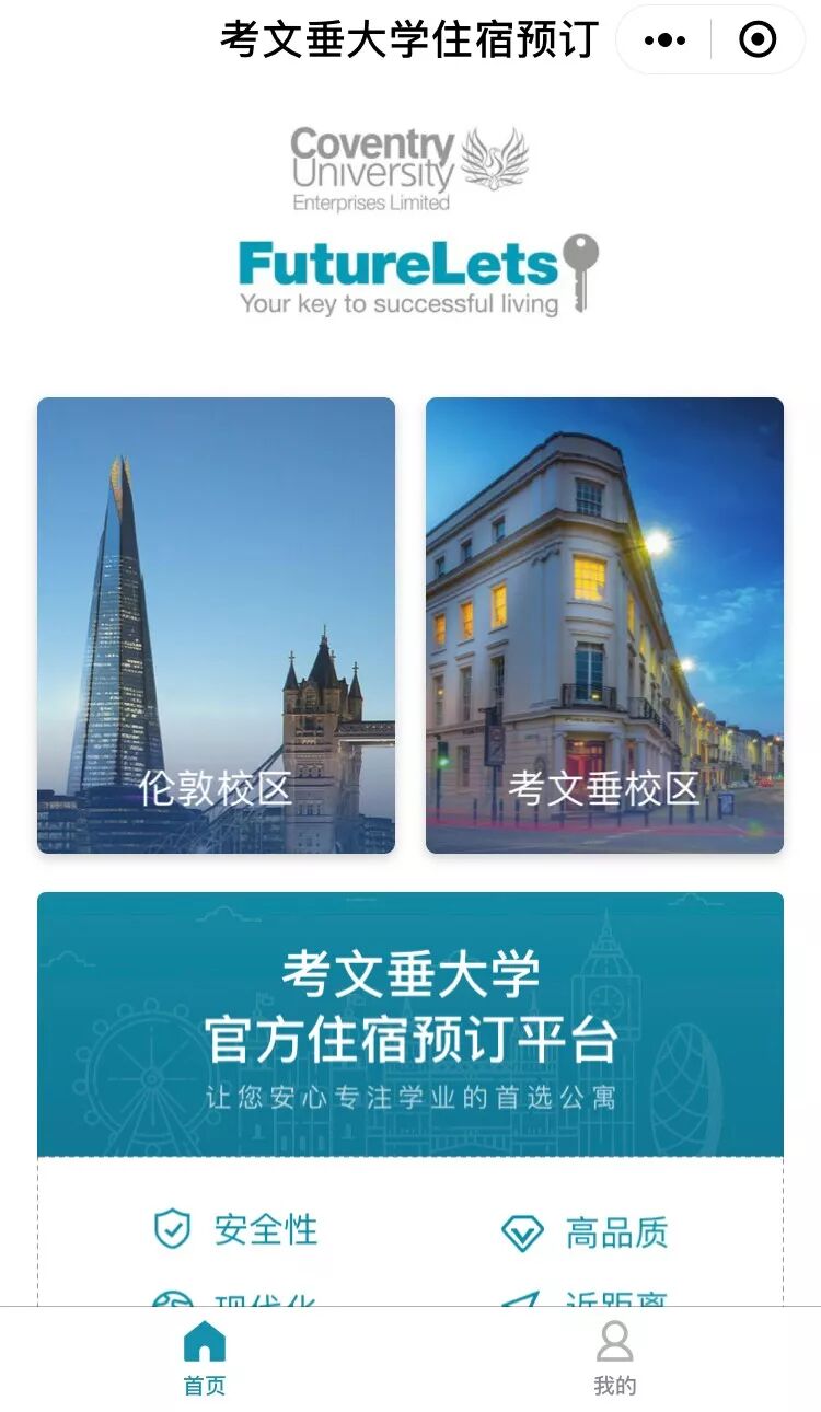 除了旅游,国外高校也会结合小程序来帮助本土以及海外的中国学生。比如英国考文垂大学宿舍中心推出了宿舍预定小程序「考文垂大学住宿预定」,更直观且视觉化的了解考文垂大学本校及伦敦校区,小程序自身集成了宿舍信息展示、预订支付、在线咨询和用户订单管理四大功能。