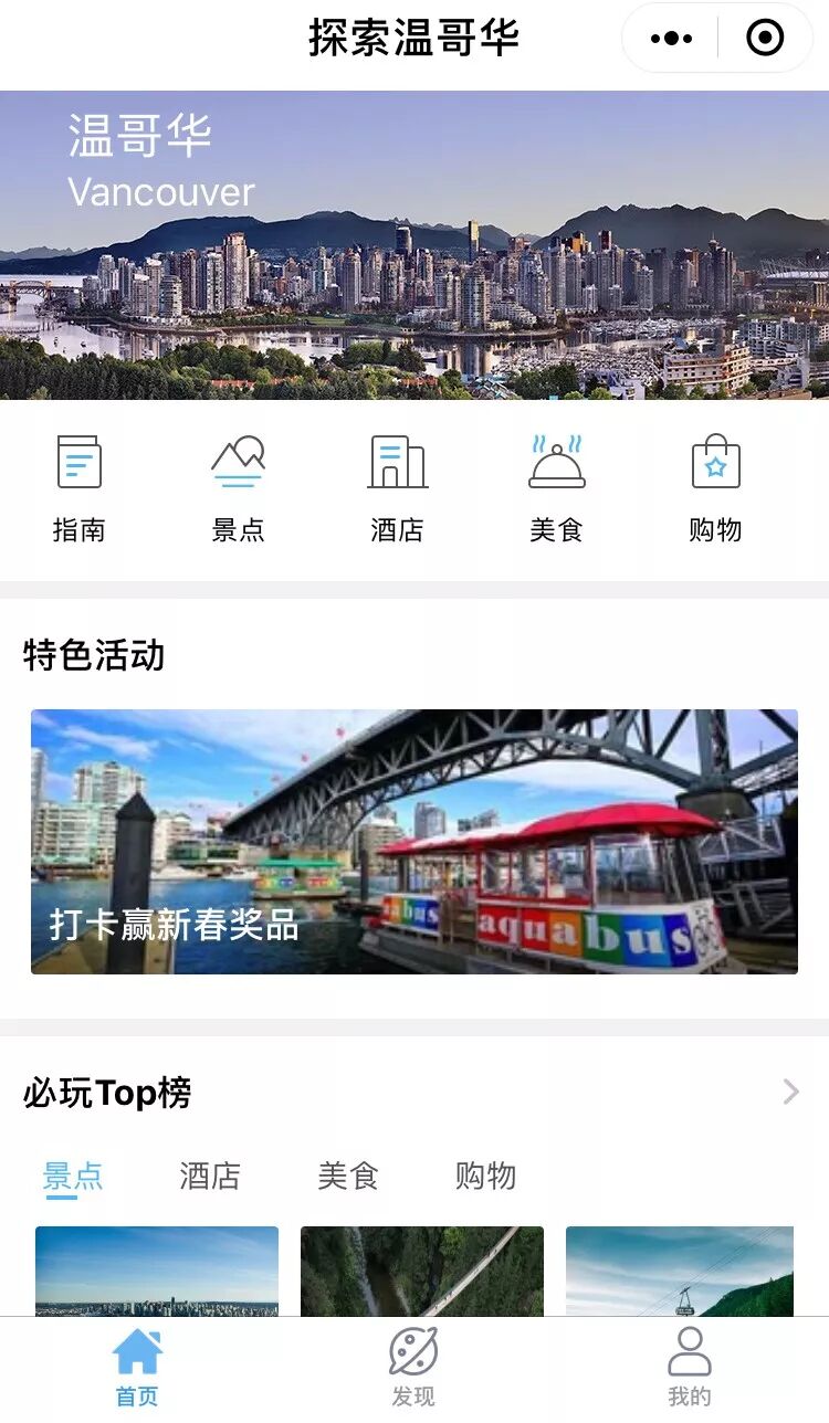 「探索温哥华」小程序由腾讯和温哥华旅游局联合打造,去温哥华旅游的游客可以直接通过搜索关键字打开小程序,里面包含了温哥华最具代表性的景点、美食,酒店位置等,小程序还具有导航功能。