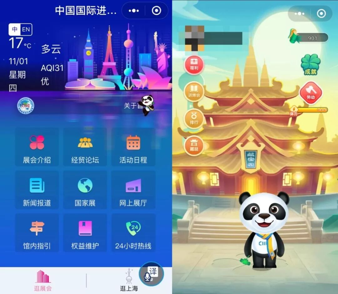 进博会官方小程序内容主要包括逛展会、逛上海两大板块,支持中英文版本的实时切换,并提供实时支持多语种语音翻译服务。「熊猫进宝」小游戏中,玩家拥有一只“进宝”熊猫,通过砍竹子或收集竹叶可以和随机的各国商人兑换与进博会展品对应的藏品。